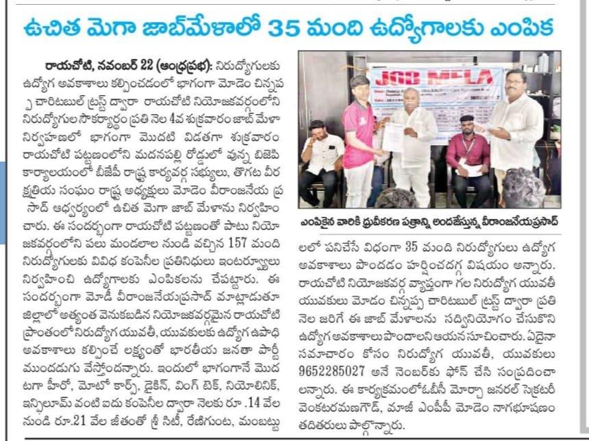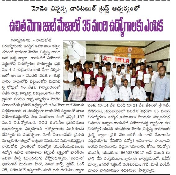 మోడెం చిన్నప్ప చారిటబుల్ ట్రస్ట్ ఆధ్వర్యంలో ఉచిత మెగా జాబ్ మేళాలో 35 మంది ఉద్యోగాలకు ఎంపిక