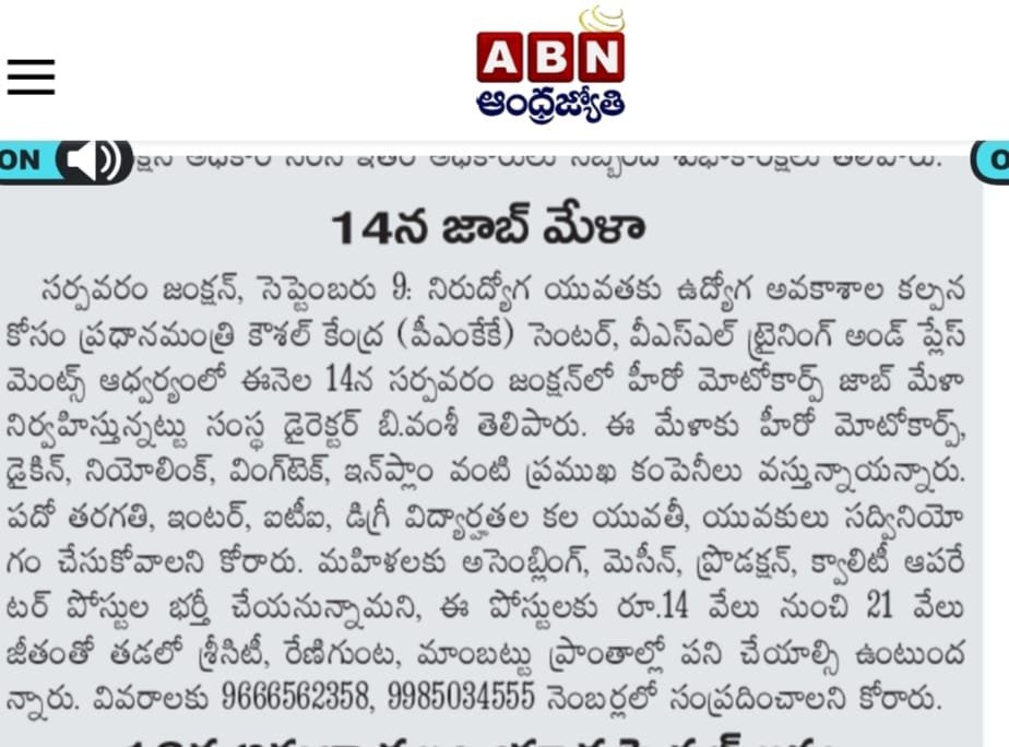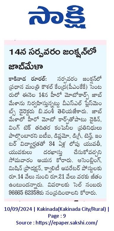 14న జాబ్ మేళా సర్పవరం జంక్షన్, సెప్టెంబరు 9: నిరుద్యోగ యువతకు ఉద్యోగ అవకాశాల కల్పన కోసం ప్రధానమంత్రి కౌశల్ కేంద్ర (పీఎంకేకే) సెంటర్