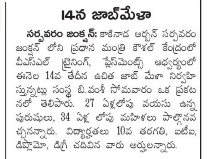 14న జాబ్మేళా సర్పవరం జంక్షన్: కాకినాడ అర్బన్ సర్పవరం జంక్షన్ లోని ప్రధాన మంత్రి కౌశల్ కేంద్రంలో